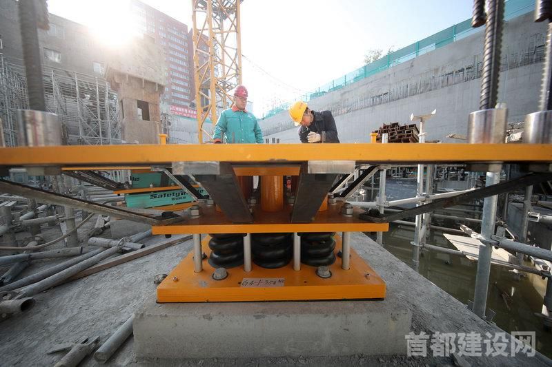 在项目党支部书记、副经理于晓看来,整套体系的核心便是黄灰相间的“棋子”。黄色的“棋子”名为滑移式弹簧隔振(震)支座,其通过弹簧来消减地铁、车辆、地震引起的振动;灰色的“棋子”如同给靴子扣上一顶帽子的靴帽橡胶支座。靴子和帽子间隔50毫米,常态时不传递地铁振动;若遇到地震时,通过多层叠合橡胶来消减地震横波带来的扰动和破坏。