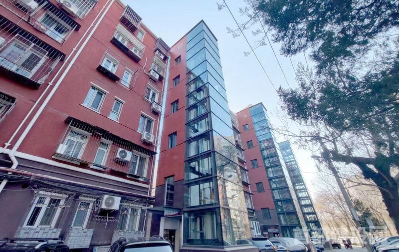在知春里西社区8号楼前,崭新的电梯矗立在单元楼前,蓝色玻璃的外观,看起来庄重大方。单元楼及以上楼道均向外延伸出两三米,形成了电梯廊桥。该电梯为半层入户的方式,即居民乘坐电梯到达相应楼层的廊桥后,须向上或向下走半层楼梯才能到达入户门。