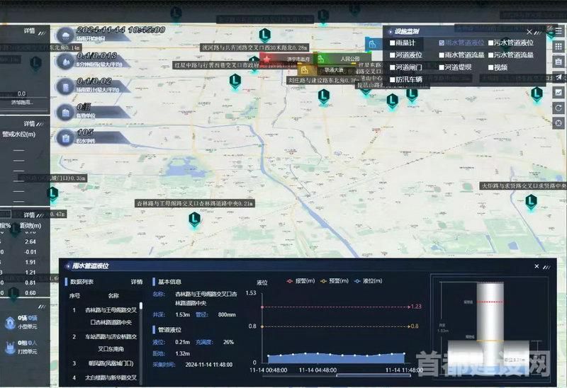 北排建设公司“防汛调度指挥可视化系统v1.0”“防汛应急指挥管理系统v1.0”,借助厂泵闸、管网、防汛单元等排水和防汛全要素实时监测和预警预报功能,实时感知水情、雨情、工情等多源数据,并依托智能分析模型,实现灾害风险的超前预警与多情景模拟。