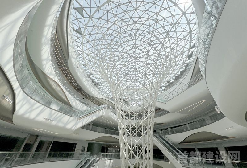 走进项目所在地,各具特色的建筑映入眼帘,华北地区最大的奥特莱斯已进入施工收尾阶段,漫步至商场的一处阳光中庭,35米高的水幕装置正在安装,未来将有“瀑布”从6层楼顶倾泻而下,有望成为新的网红打卡点。在另一处中庭,高耸的马蹄莲造型装置呈螺旋状向下延伸,未来还将与led屏“搭档”,为顾客带来光影秀。